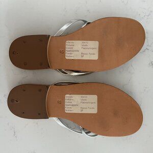 Features: custom made, slip on, leather inner and outer sole, manmade strappy pper in Platinum/Silver colors, 1/2" heel, thong style, vacation, travel