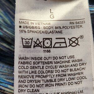 84% polyester, 16% spandex. Machine-wash cold and gentle, tumble-dry low.