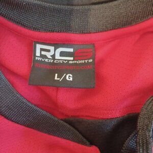 This pre-owned jersey is in size L. Stamped Wise Guys on the front with the number 12 on the back. Features a patch stating Special Olympics Manitoba. Note that the colors red, black, white, and yellow are not stamped on but are four separate materials which are sewn together. Note the condition issues- see photos. We have many other fine items for sale and bundles save on shipping. We also have three other jerseys, the exact same logo, different numbers and different sizes. Bundles save on shipping. Check out the closet. Thanks.4614