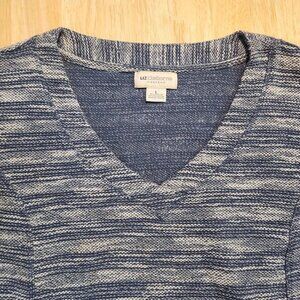 Liz Claiborne Weekend navy and white knit lightweight sweater/tunic, women's size L. V-neck, 2 front pockets, 3/4 sleeves.