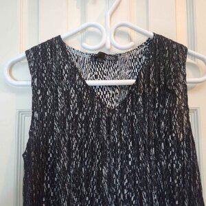 Ness dressy sleeveless V-neck blouse, size large. Textured black semi-sheer mesh outer layer over coloured patterned inner layer.
