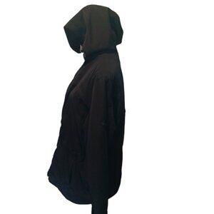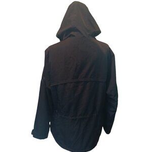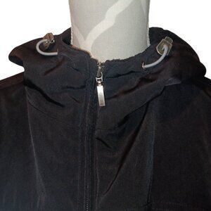 Features a lined hood which can be tightened around the face with elastic cord and toggle.