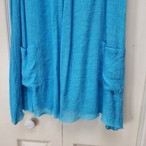 This gorgeous lightweight short turquoise sundress, size large or medium, by Wilhelmina's, is 50% silk and 50% cotton! Light and breezy for summer, it also has two handy slouchy pockets.