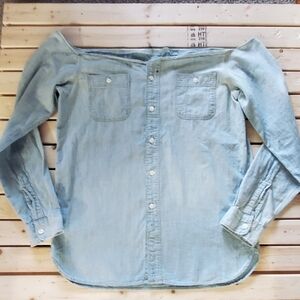 A mens denim shirt was transformed into this off shoulder light wash denim top instead of landing in the landfill.