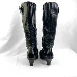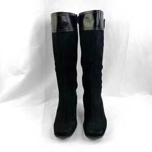 La Canadienne Black Tall Boot | Victorian Style Leather Boots | Below the Knee | Women's Size 6 1/2 M | Patent Leather and Suede | Side Zipper | Low Heels | Made in Canada