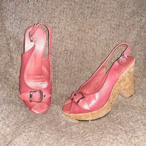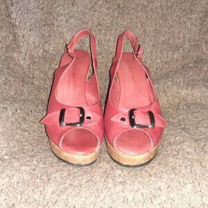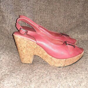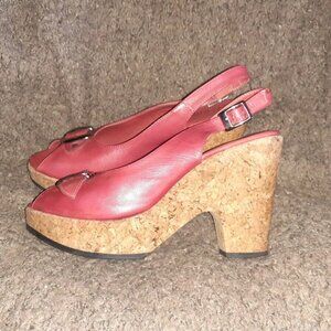 LA CANADIENNE-Red Leather-Silver Buckle-Cork Platform Slingbacks-Sz 39-Excellent