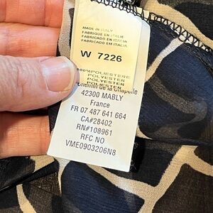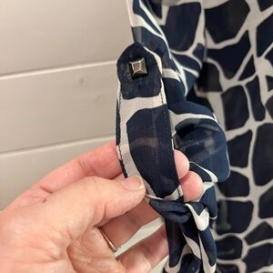 Chic and lightweight blouse with a navy blue abstract giraffe-style print on a beige background. It features a flattering V-neckline, decorative shoulder tabs, and long roll-up sleeves with button tabs. Slightly sheer — can be layered with a cami. Excellent condition.