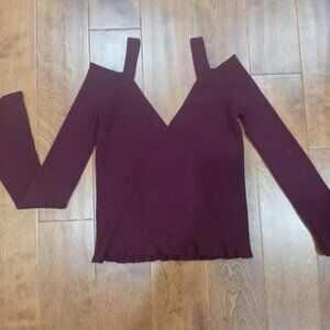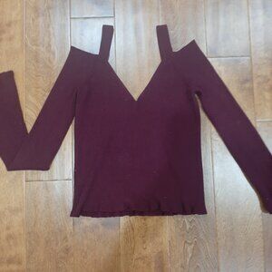 This is a ribbed sweater with a v neck and straps with an off shoulder sleeve. There is a bell sleeve and a lettuce edge on the bottom of sleeves and top. Very feminine and looks nice paired with bralette underneath. The sleeves were too long for me as you can see, but its a beautiful sweater in great condition.