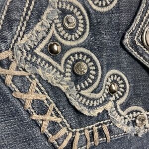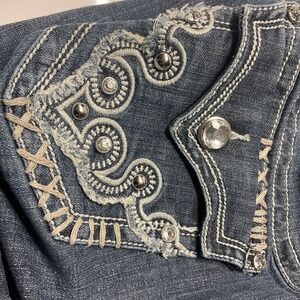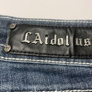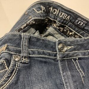 L.A. IDOL CROPPED JEANS SZ13 W35 X L18 CRYSTALS STUDS HEAVY STITCHING