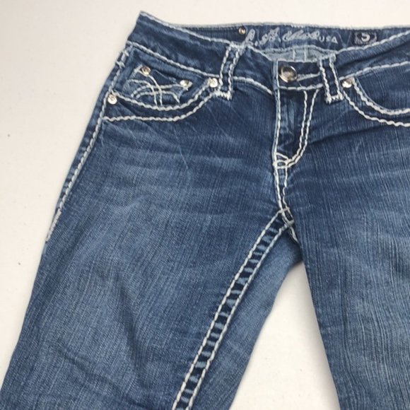 Y2K blue jeans with white stitching. Features unique pocket design. Perfect for wearing in to a baby doll blouse!