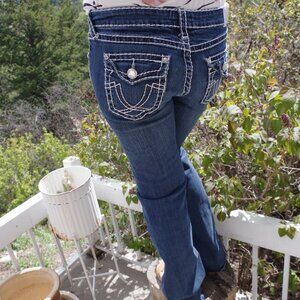 Dark wash L.A Idol U.S.A women's boot cut long ,thick stitching ,with rhinestones on pockets .Size 11 /29 waist by 32 long. In very good condition .From 2018.Low rise