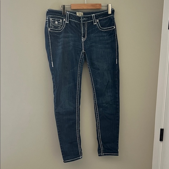 Stylish navy skinny jeans. Features white contrast stitching. Perfect for everyday wear except its missing a button on the middle but it’s in great condition sized 11 waist length is 17 1/2 inches hip width is 19 3/8 inches and jeans length is 38 inches