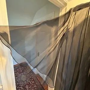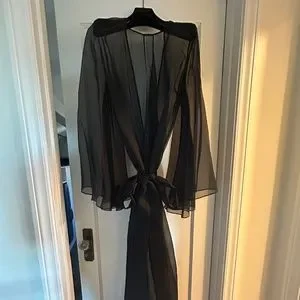 Rosamosario Long elegant robe with wide sleeves and a waist tie. Flowing, gorgeous drape. Sheer black silk chiffon fabric.