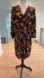 La Petite Francaise knee length dress. Multi colour floral blur pattern including yellow, red, white on a black background. V Neck with a button front. Shoulder pads that stick out into the sleeve to hold the slight puff sleeve at the top. 3/4 length sleeves. Unlined. 100% viscose. Made in France.