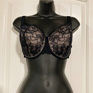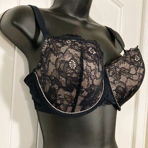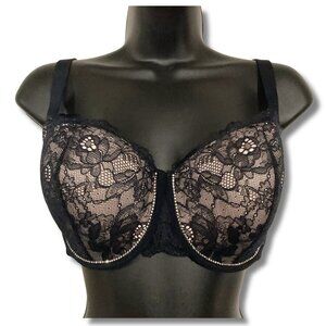 LA SENZA 34DD Black and nude pink floral lace underwire bra w/ clear rhinestones