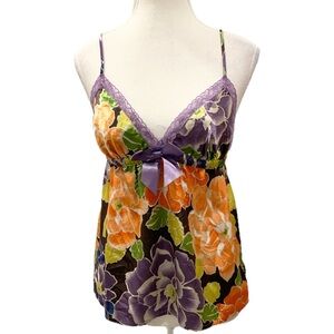 La Senza Floral cami in orange & Purple hues. Lace detailing and bow on front, keyhole closure with button on back, adjustable straps.
