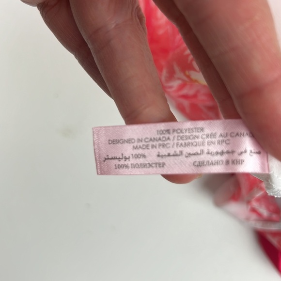 Semi sheer v-neck with a white base and pink flowers. Adjustable straps and tie at back. Has elastic smocking at back for a snug fit.
