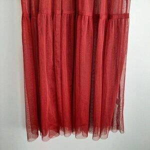 LACE & BEADS \ Sheer Mesh Tiered Pleated Maxi Long Dress Burgundy Red M Flawed