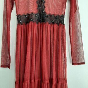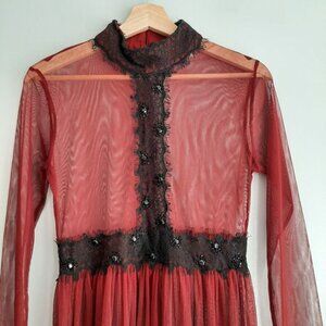 • Sheer long sleeve high neck long maxi length dress in burgundy red with black lace and gem details. Unlined, missing removable slip.