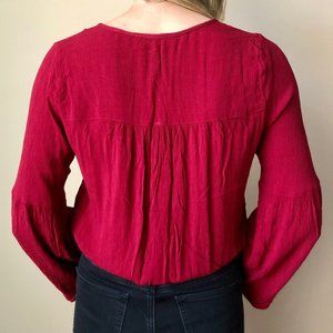 Flowy bell sleeve top with lace detailing on the front, shoulders, and neckline.