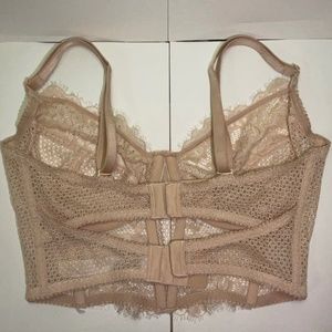 Beige lace bra with a flower based embroidery, and two clasps for extra adjustment. 👙