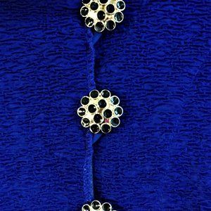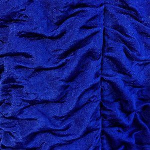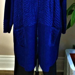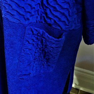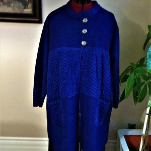 LACE knee-length blue coat with a stand up collar, long sleeves, three buttons and two pockets. The coat has two different textured blue fabric of which one is used as a contrast for the collar, front middle sections, pockets and a sleeve border hemline of 4.75". The fabric is made of 95% polyester and 5% spandex.