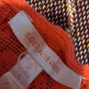 This is a perfect dress for hot summer days. It's a beautiful orangey-coral and is a lightweight and breathable fabric. It has a bit of a textured look and feel. Sort of like a linen. The fabric is blended (see photo above for fabric content). The neckline and hemline have lovely floral lace panels. Lining the lace panel on the chest is a strip of geometric embroidery. It has a scoop neck and shift cut body. There is a lining. Very feminine, summery, comfortable, and boho chic. It's in beautiful condition.