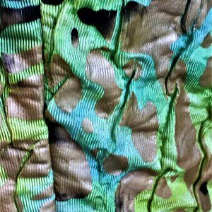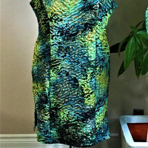 LACE sleeveless animal print pencil dress with round neckline. The dress is lined and the animal print has different shades of green and blue along with the colors black, tan and cream. The length of the dress is approximately 33" from the back neckline to the hemline. The fabric is made of 95% polyester and 5% spandex.