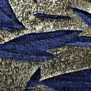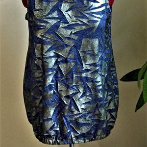 LACE silver metallic blue leaf print sleeveless top with a round neckline and an elastic at the hemline to give puffiness. The length of the top is approximately 30" from the back neckline to the hemline. The fabric is made of 95% polyester and 5% spandex.
