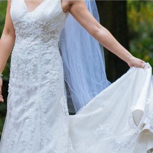 Lace wedding dress, ivory colored, worn for about 6 hours, I'm street size 2-4, about 115-120 lbs, there is room for alterations to the length, I'm 5"3 and wore 3" heels with the dress and it was still a tad bit long, cathedral length train, tiny snags on train but not visible unless you're specifically looking for it