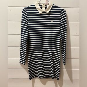 Chic and timeless navy & white striped mini dress with a classic white Peter Pan collar and back zip closure. Signature crocodile logo embroidered at the chest. Soft cotton knit fabric, perfect for cooler days or layered looks.
