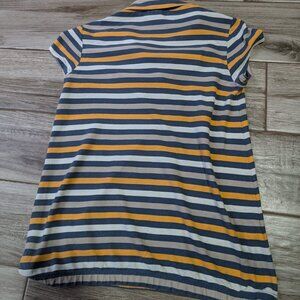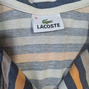 Lacoste women’s collared polo shirt, size 38 (Small), in a bold striped pattern of navy, orange, and off-white.