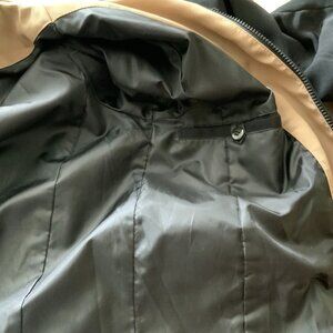 Very good condition - Black hooded jacket with tan lining / 2 front pockets / inside pocket with button. Made by White Stag.