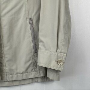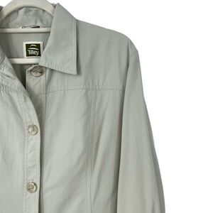Nice lightweight Tilley ladies jacket. Cream colour and features button closure, button closure at wrist, along with two zippered front pockets.