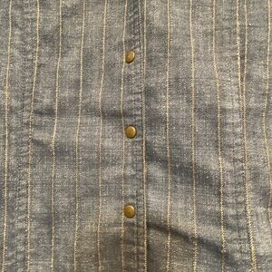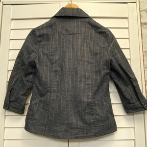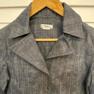 Super cute ladies Veeko jacket. Denim look with tan coloured stripe detail. Sleeves are 3/4 length. Faint stain on the back of the left sleeve as indicated in photos. Otherwise in great condition!