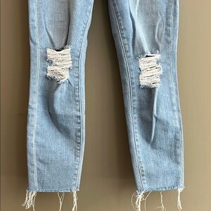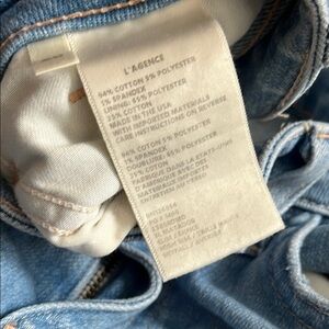 These light blue, high-rise, slim fit jeans from L'AGENCE showcase a vintage-inspired distressed design with intentional rips at the knees and a raw hem for a relaxed, worn-in look. The light wash denim adds a touch of casual elegance, making them perfect for everyday wear.