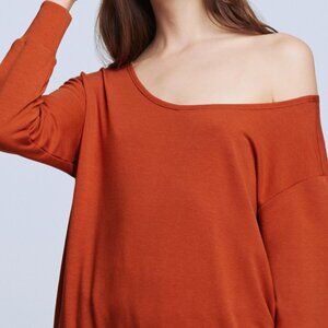 L'AGENCE Kimora Off Shoulder Top in Rust. Sweatshirt design with a relaxed silhouette with off-the-shoulder detailing, wide neckline, banded hemline, and long sleeves. Effortless chic and versatile design offering both comfort and style. 47% Cotton / 47% Modal, 6% Spandex. Brand new, never worn, with tags.