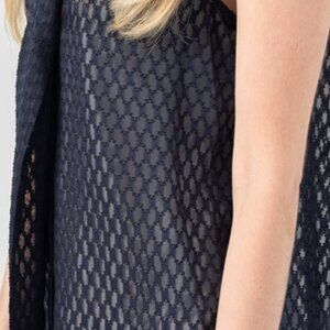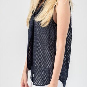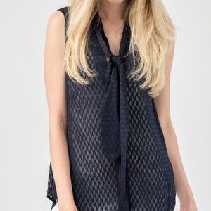 L'AGENCE Natalia Necktie Blouse in Midnight. An elevated design with a versatile self-tie bow and V neckline. Designed in a dark blue semi-sheer fabric with geometric stitch pattern and patterned burnout chiffon. V neckline, sleeveless, button-down closure, curved hemline, inverted box pleat at back. 100% Polyester. Brand new, never worn, with tags.