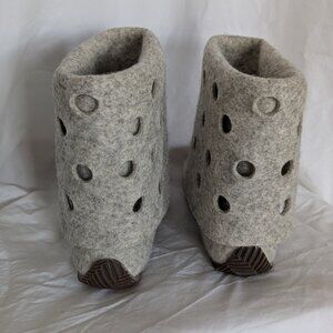 A pair of gray handmade felt/wool folded ankle winter boots from Finland. The folded layer of the boot covers the ankle and the lower calf with a scattered hole pattern providing lots of warmth during the cooler season.