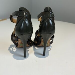 Sophisticated black and brown heels with unique strap design. Ideal for a night out.