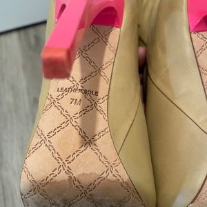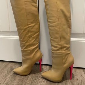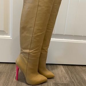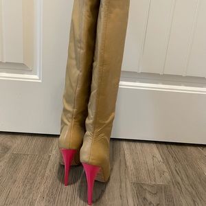 These are tan over the knee boots with a neon pink heel from L.A.M.B. By Gewn Stefani.