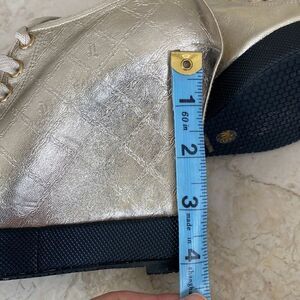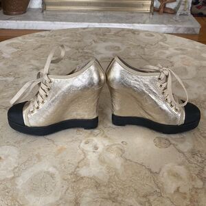 In as new condition gorgeous LAMB Gwen Stefani leather platform wedge sneakers.  In a striking monogrammed gold leather with stylish design taken from vintage sneakers.