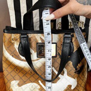 Stunning vintage 2000's Y2K LAMB bag, by Gwen Stefani. Brown/tan, black and white faux saffiano style leather bag, with LAMB logo monogram, and gold tone hardware. Slight scratches to gold tone plate on front due to occasional use.