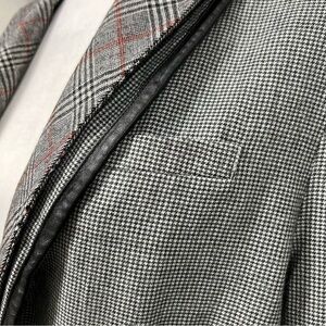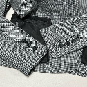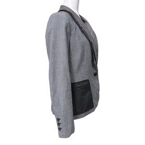 Good condition. No rips or stains. Beautiful combination of tweed, check, and leather. Outer: 100% wool with genuine leather trim / pockets. Lining: Acetate & viscose. Perfect for office to party.