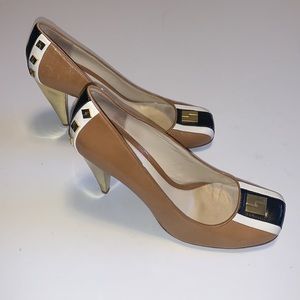 VGUC L.A.M.B. tan patent leather pumps with black and white accents, gold heels, and gold metal details in women’s size nine and a half (9 1/2).