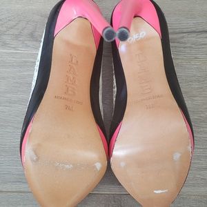 Black and white snake print pumps with pointy toe and stiletto heel. Hot pink accents at the heel and on the platform. 1/2" platform, 5" heel. No box.