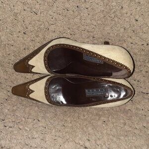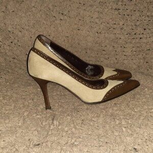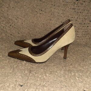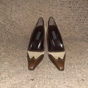 LAMBERTSON TRUEX-Brown Leather-Beige Suede-Snip Toe Brogue Pump-Sz37.5-Excellent