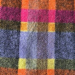 DESCRIPTION: A beautiful plaid knit in purple, pink, yellow, green & orange. It will add colour and warmth to any winter outfit. Fringes.