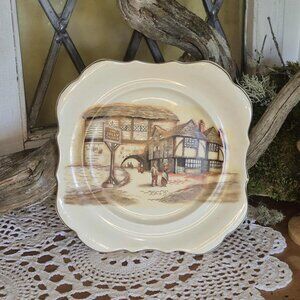 Vintage collectible plate by Lancasters Ltd, made in Hanley, Staffordshire, England. Entitled "The Jolly Drover", this english ware in rich shades of cream and brown depicts a yesteryear towns scene, with thatched cottages and stone-paved streets. To add an old-fashioned historical touch to your decor, hang it on the wall or display it in your china cabinet!