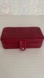 Lancome burgundy trinket or jewelry box has a hinged lid and closes with a snap closure. Faux leather in snakeskin pattern. Fabric lining interior of box and underside of box.